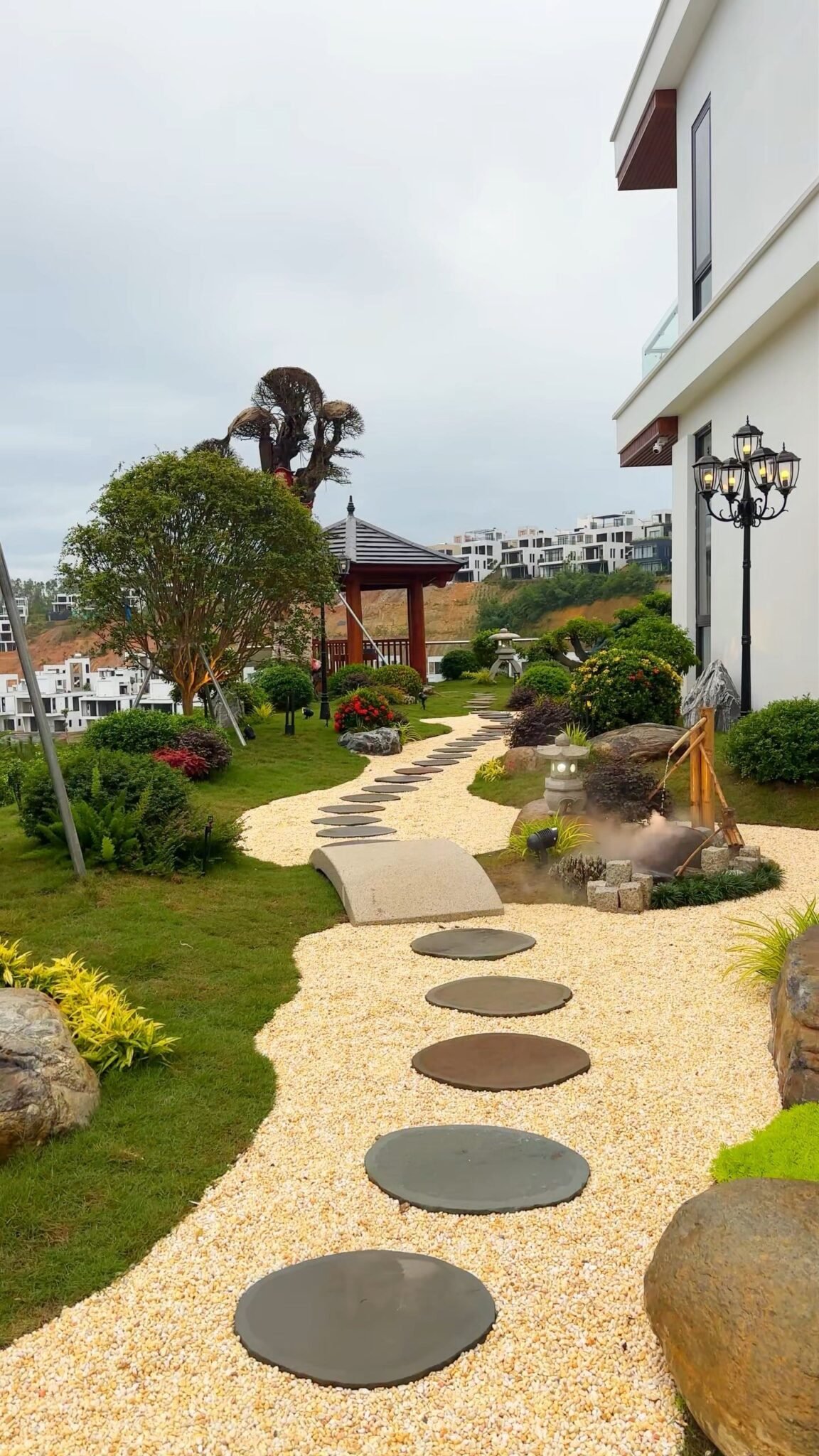 Mang đậm tinh thần thiền, phong cách này chú trọng sự cân bằng và tối giản. Đá, nước, cây bonsai, hồ cá Koi, lối đi lát đá cuội… được sắp đặt có chủ đích, tạo nên không gian thanh tịnh và gợi mở chiều sâu văn hóa. Thiết kế sân vườn Nhật Bản thường phù hợp với những gia chủ yêu thích sự tĩnh lặng và tinh tế.