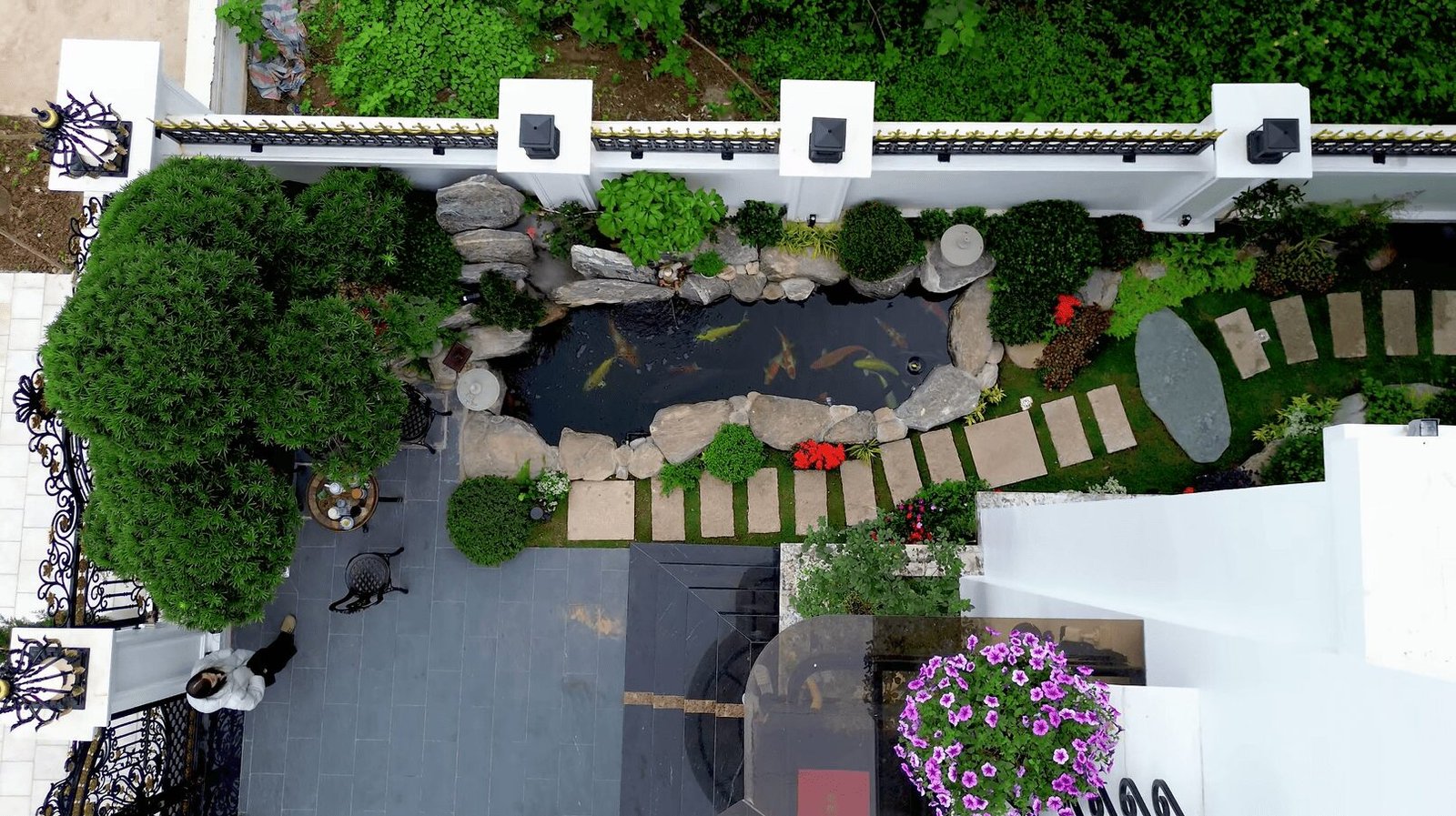 Đặc trưng của thiết kế sân vườn phong cách Trung là sự hùng vĩ, gần gũi với thiên nhiên, kết hợp khéo léo giữa hòn non bộ, hồ nước và tiếng nước chảy róc rách. Các yếu tố này mang lại cảm giác thư thái và thể hiện sự giao hòa giữa con người và cảnh quan trong thiết kế sân vườn phong cách Á Đông.